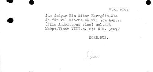 //// Utan prov //// Jag frågar Hin ätter Herrgåls-Ola //// ^^ Ja får väl klocka så väl som han..* //// (Nils Anderssons visa) mel.not //// Mskpt.Visor VIII.s. 871 E.U. 32072 //// NORD. ms. //// r ////