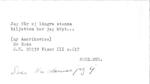 //// Jag får ej längre stanna //// biljetten har jag köpt... //// (ny Arnerikavisa) //// Dr Boda //// E.U. 20238 Visor III s+617 //// NORD. ms. ////