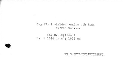 //// f ' //// I //// i //// Jag får i världen vandra och lida //// mycken nöd.... //// (Av C.H.Nilsson) //// Se: E 1876 uu,z*'; 1877 zz //// KB:S SKILLINGTRYCKSREG. ////