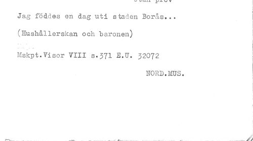 //// ; //// Jag föddes en dag uti staden Boras... //// ! //// (Hushållerskan och baronen) ! //// - //// .. //// Mskpt.Visor VIII s-371 E.U. 32072 //// NORD.MUS. //// ! //// J //// j //// < ////