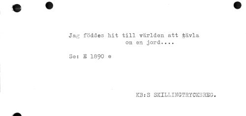//// Jag föddes hit till världen att tävla //// om en jord.... //// Se: E 1890 e //// KB:S SKILLINGTRYCKSREG. ////