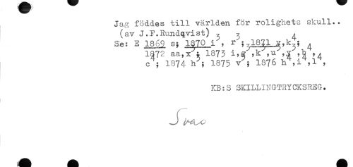 //// Jag föddes till världen för rolighets skull., //// (av J.F.Rundqvist) ? ^ / //// Se: E 1869 s; 1870 i , r'; 18?1 ^ //// 1372 aa,VTl873 i.S ^ ,u ,y , , //// c ; 1374 h ; 1875 v ; 1876 , //// KB:S SKILLINGTRYCKSREG. ////