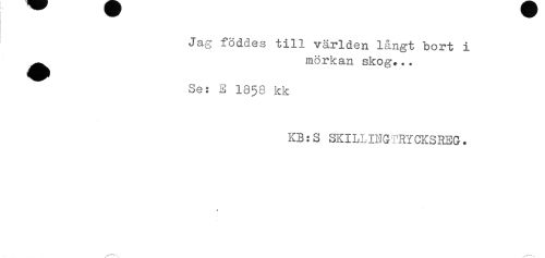 //// Jag föddes till världen långt bort i //// ^^ mörk an skog... //// Se: E 1858 kk //// KB:S SKILLINGTRYCKSREG. ////