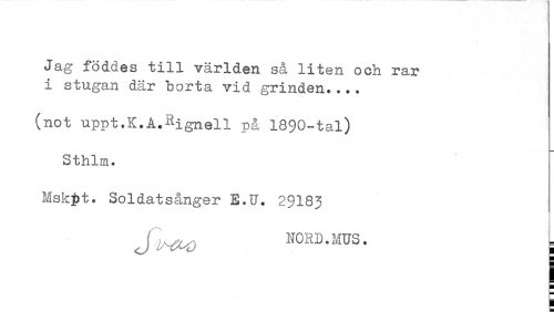 //// Jag föddes till världen så liten och rar //// i stugan där borta vid grinden.... //// (not uppt.K.A.Rignell på 1890-tal) //// Sthlm. //// Mskpt. Soldatsånger E.U. 29183 //// NORD. HUS. = //// ! ////