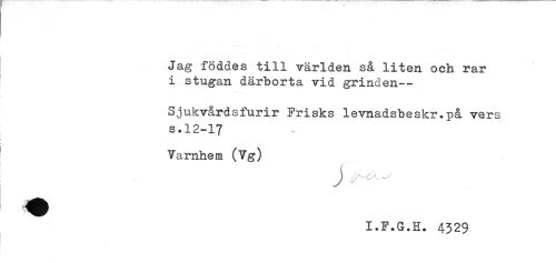 //// Jag föddes till världen så liten och rar //// i stugan därborta vid grinden— //// Sjukvårdsfurir Frisks levnadsbeskr.på vers //// s.12-17 //// < //// ' Värnhem (Vg) //// I.F.G.H. 4329 ////