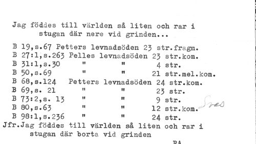 //// Jag föddes till världen så liten och rar i //// stugan där nere vid grinden... //// B 19,s.67 Petters levnadsöden 23 str.fragm. //// B 27:l,s.263 Pelles levnadsöden 23 str.kom. //// B 31:1,s.30 " " 4 str. //// B 50,s.69 " " 21 str.mel.kom. //// B 68,s.124 Petters levnadsöden 24 str.kom. //// B 69,s. 21 " " 23 str. //// B 73:2,s. 13 " " 9 str. //// B 80,s.63 " ^ 12 str.kom.^ ^ //// B 98:l,s.236 " " 24 str. //// Jfr.Jag föddes till världen så liten och rar i //// stugan dar borta vid grinden //// 13 A ////