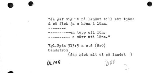 //// "Ja gaf mig ut på landet till att tjäna //// å så fick ja e höna i löna. //// -----en tupp uti lön* //// -——-----e märr uti löna." //// Vgl.Ryda 313:5 a s.8 (8:0) //// Sandström //// (Jag gick mit ut på landet ) //// i ////