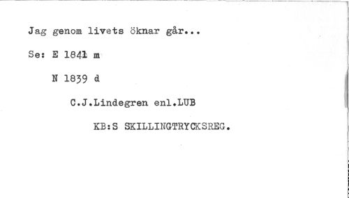 //// Jag genom livets öknar går... //// Se: E 184^ m //// N 1839 d j //// C.J.Lindegren enl.LUB I //// KB:S SKILLINGTRYCKS3EG. ////