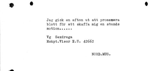 //// * * //// Jag gick en afton ut att promenera //// blott för att skaffa mig en stunds //// motion.*.... //// Vg Sexdrega //// Nskpt.Visor E.U. 42662 //// NORD. I€US. ////