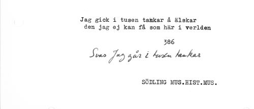 //// Jag gick i tusen tahkar å älskar //// den jag ej kan få som här i verlden //// 386 //// SODLING KUS.HIST.MUS. ////
