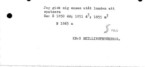 //// Jag gick mig ensam utåt lunden att //// H Se: E 1850 dd; 1851 d^; 1855 m^ //// N 1865 a //// J) //// KB:S SKILLINGTRYCKSREG. //// \ ////