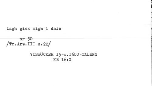 //// I //// i //// Iagh gick migh i dale //// nr 50 ------ //// /Tr.Arw.III s.22/ //// VISBÖCKER 15-0.I6OO-TALENS //// KB 16:0 ////