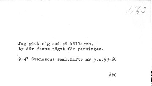 //// v //// Jag gick mig ned på källaren, //// ty där fanns något för penningen. //// .... t- //// 9:4? Svenssons saml.häfte nr 5.s.59-60 //// ÅBO //// < ////
