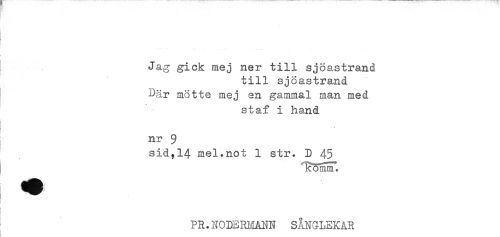 //// ! //// Jag gick mej ner till sjöastrand //// till sjöastrand //// Där mötte mej en gammal man med //// staf i hand //// nr 9 //// sid,14 mel.not 1 str. D 45 //// kornm". //// ^ y //// PR.NODERHANN SÅNGLEKAR ////