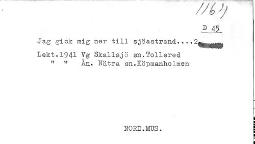 //// D 45. //// Jag gick mig ner till sjöastrand.... //// Lekt.1941 Vg Skallsjö sn.Tollered //// O //// " " Ån. Nätra sn.Köpmanholmen //// NORD.MUS. i ////