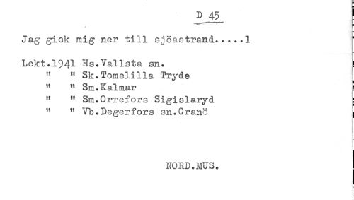 //// D 45_ ' //// Jag gick mig ner till sjöastrand.....1 //// Lekt.1941 Hs.Vallsta sn. ^ //// " " Sk.Tomelilla. Tryde L //// " " Sm.Kalmar ! //// " " Sm.Orrefors Sigislaryd : //// n n Vb.Degerfors sn.Granö ] //// NORD. ms. ////