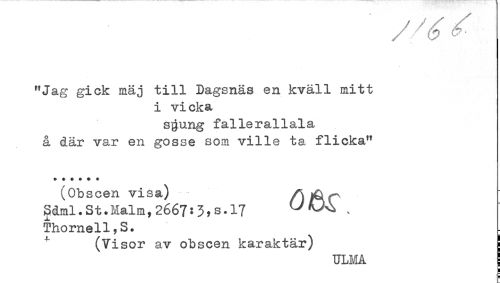 //// "Jag gick mäj till Dagsnäs en kväll mitt //// i vi eka //// sgung fallerallala //// å där var en gosse som ville ta flicka" //// ****** //// (Obscen visa) //// Sdml.St.Malm,2667:3*s.l7 , //// Thornell,S. //// (Visor av obscen karaktär) ! //// ULMA ////