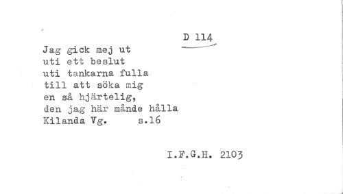 //// D 114 //// Jag gick mej ut //// uti ett beslut //// uti tankarna fulla //// till att söka mig //// en så hjärtelig, //// den jag här månde hålla //// Kilanda Vg. s.16 //// I.F.G.H, 2103 //// t ////