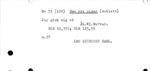 //// No 73 (100) Den yra piaan (dublett) //// Jag gick mig ut //// Åb.Nl.Wefvar. //// SLS 82,391; SLS 125,56 //// s.27 //// ÅBO SJÖBERGS SAML. ////