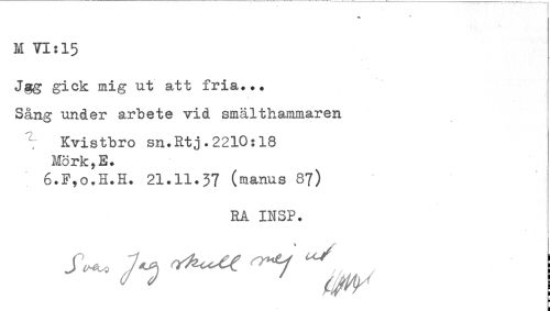 //// M VI:15 //// Jgg gick mig ut att fria... //// Sång under arbete vid smälthammaren //// 1 Kvistbro sn.Rtj.2210:18 //// Mörk,E. //// 6.F,o.H.H. 21.11.37 (manus 87) //// RA INSP. //// } ////