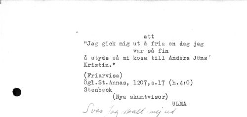 //// * //// att //// "Jag gick mig ut å fria en dag jag //// var så fin //// å styde så mi kosa till Anders Jöns" //// Kristin." //// (Friarvisa) //// Ögl.St.Annas, 120?,s.17 (h.4:0) //// Stenbeck //// ^^ (Nya skämtvisor) //// ULMA ////