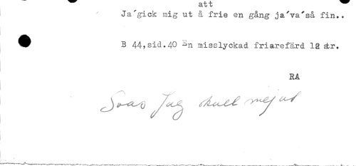 //// ! ^ Ja/gick mig ut å frie en gång ja^va^så fin*. //// V B 44, sid. 40 ^n misslyckad friarefård Ig //// RA //// - ////