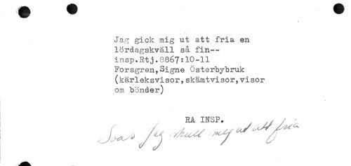 //// Jag gick mig ut att fria en //// lördagskväll så fin— //// insp+Rtj.8867:10-11 //// Forsgren,Signe Österbybruk //// (kärleksvisor,skämtvisor,visor //// om bönder) //// RA INSP. / ' ////