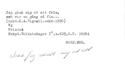 //// Jag gick mig ut att fria, //// ooh var en gång så fin... //// (uppt.K.A.Rignell.omkr.1890) //// Vg //// Fristad //// Mskpt.Soldatsånger l\s.629,E.U. 28204 //// NORD.MUS. //// / v" V ' ////