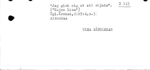 //// "Jag gick mig ut att skjuta". ____i. //// ("Kajsa Lisa") //// Ogl.Krokek, 2287:4, ^.3) //// ^^^ Aldenius //// ULMA SÅNGLEKAR //// * //// t ////