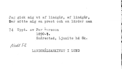 //// H //// ! //// H //// - //// Jag gick mig ut af lindgår, af lindgår. //// Der mötte mig en prest och en lärder man ^ //// i //// 74 Uppt. av Per ^srsson //// 1890-t. ' //// Snårestad, Ljunits hd Sk. ! //// / Q //// LANDSMÅLSARKIVET I LUND ////