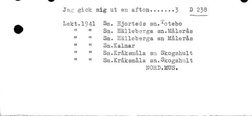 //// Jag gick mig ut en afton.......3 D 238 //// ^ Lekt.1941 Sm. Hjorteds sn.^otebo //// " " Sm. Hälleberga sn.Nålerås //// " " Sm. Hälleberga sn Målerås //// " " Sm. Kalmar //// " " Sm.Kråksmåla sn Skogshult //// " " Sm.Kråksmåla sn.Skogshult //// NORD.MUS. ////