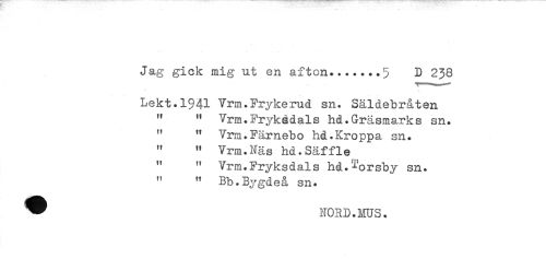 //// Jag gick mig ut en afton.......5 D 238 //// Lekt.1941 Vrm.Frykerud sn. Säldebråten //// " " Vrm.Fryksdals hd.Gräsmarks sn. //// " " Vrm.Färnebo hd.Kroppa sn. //// " " Vrm.Näs hd.Säffle //// " " Vrm.Fryksdals hd.^orsby sn. //// " Bb.Bygdeå sn. //// ^ NORD.MUS. ////