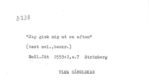 //// D13 ^ //// "Jag gick mig ut en afton" //// (text mel.ybeskr.) //// Smal.Jät 2559:2,s.? Strömberg //// * * t //// ULMA SÅNGLEKAR ////