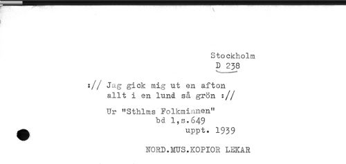 //// \ //// t //// f //// Stockholm //// D 238 //// :// Jag ^ick mig ut en afton //// allt i en lunå så grön :// //// Ur "Sthlms Folkminnen" //// bd 1,S.649 //// ^ uppt. 1939 //// NORD.MUS.KOPIOR LEKAR ////