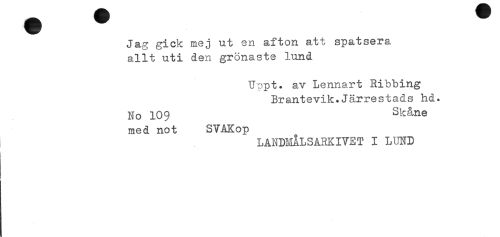 //// Jag gick mej ut en afton att spatsera //// allt uti den grönaste lund //// Uppt. av Lennart Ribbing //// Brantevik.Järrestads hd. //// No 109 Skåne //// med not SVAKop //// LANDMALSARKIVET I LUND ////