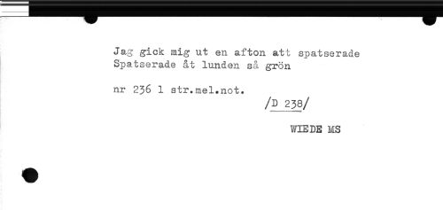 //// Jag gick mig ut en afton att spatserade //// Spatserade åt lunden så grön //// nr 236 1 str.mel.not. //// /D 238/ //// . //// WIEDE MS ////