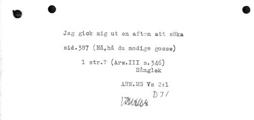 //// Jag gick mig ut en afton att söka //// sid.337 (Hå,hå du modige gosse) //// 1 str.? (Arw.III s.346) //// Sånglek //// AR?;.MS Vs 2:1 //// 37/ //// * * ////