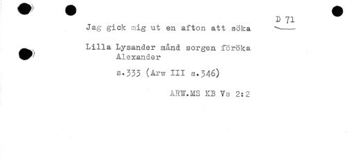 //// D 71 //// Jag gick mig ut en afton att söka ^- //// ^^ Lilla Lysander månd sorgen föröka //// ty' Alexander //// s.333 (Arw III s.346) //// ARW.MS KB Vs 2:2 ////