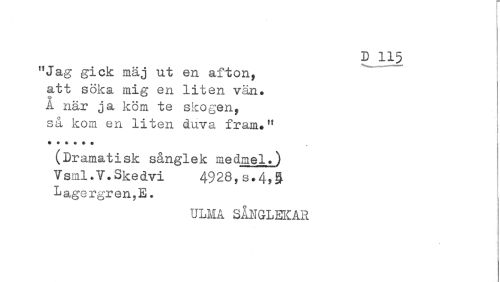 //// t //// D 115 //// "Jag gick mäj ut en afton, //// att söka mig en liten vän. //// A när ja köm te skogen, //// så kom en liten duva fram." 1 //// + *** + * //// (Dramatisk sånglek medmel.) //// Vsml.V.Skedvi 4928,s.4,§. //// Lagergren^E. //// ULHA SÅNGLEKAR ////