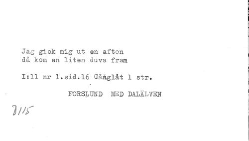 //// Jag gick mig ut en afton //// då kom en liten duva fram //// i //// 1:11 nr 1.sid.16 Gånglåt 1 str. //// * //// FORSLUND MED DALÄLVEN //// t ////