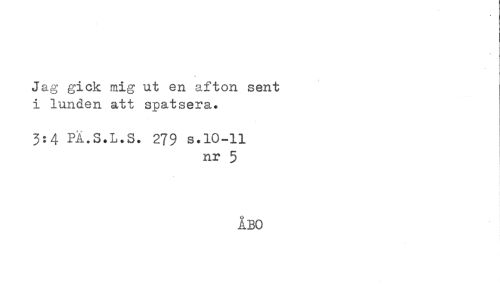 //// Jag gick mig ut en afton sent //// i lunden att spatsera. //// 3:4 PÅ.S.L.S. 279 s.10-11 //// nr 5 ////
