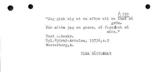 //// "Jag gick mig ut en afton uti en lund sa //// grön. //// Där mötte jag en gosse, så fage^ch så //// skön." //// Text o.beskr. //// Upl.Bjorkö-Arholma, 19736,s.2 //// Westerberg,A. //// ULMA SÅNGLEKAR ////