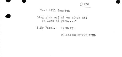 //// P 238 //// Text till danslek //// ^^ "Jag gick mej ut en afton uti //// en lund så grön...." //// S.Ny Verml. 1738:171 //// FOLKLIVSARKIVET LUND ////