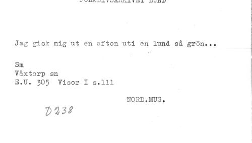 //// F //// Jag gick mig ut en afton uti en lund så grön... //// < * //// Sm //// Våxtorp sn //// E.U. 305 Visor I s.lll //// NORD.MUS. //// t ^ //// * ////