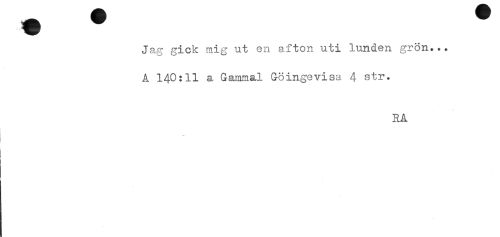 //// Jag gick mig ut en afton uti lunden grön... //// A 140:11 a Gammal Göingevisa 4 str. //// RA //// < * //// ! ////