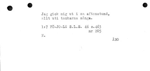 //// Jag gick mig ut i en aftonstund, //// allt uti tankarna många. //// 1:7 FO-JO-LE S.L.S. 46 s.463 //// nr 205 //// N. //// ÅBO ////