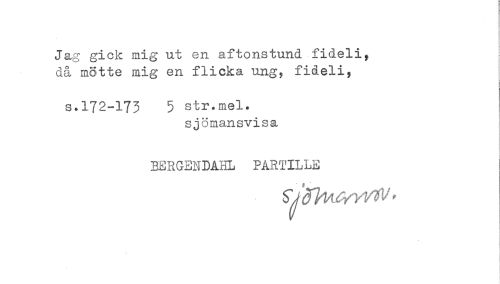 //// Jag gick mig ut en aftonstund fideli, //// då mötte mig en flicka ung, fideli, //// : //// s.172-173 5 str.mel. //// sjömansvisa //// BERGENDAHL PARTILLE ////
