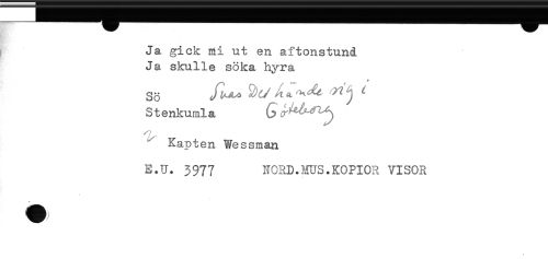 //// t Ja gick mi ut en aftonstund //// Ja skulle söka hyra //// Stenkumla G //// Kapten Wessman //// E.U. 3977 NORD.MUS.KOPIOR VISOR //// * ////