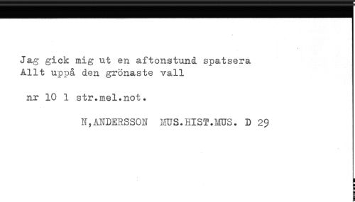 //// Jag gick mig ut en aftonstund spatsera //// Allt uppå den grönaste vall //// nr 10 1 str.mel.not. //// N.ANDERSSON MUS.HIST.NUS. D 29 ////