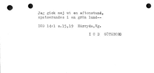 //// Jag gick mej ut en aftonstund, //// spatserandes i en grön lund— //// IOD 14:1 s.15,19 Härryda,7g. //// IOD GÖTEBORG //// i //// ! ////